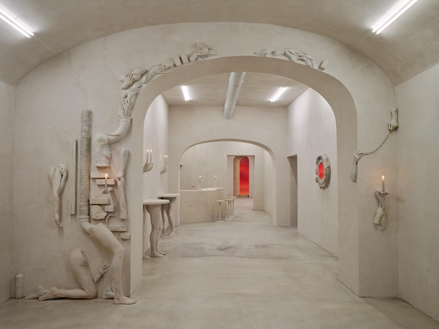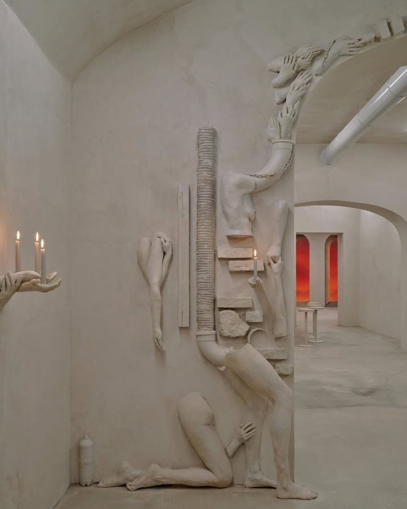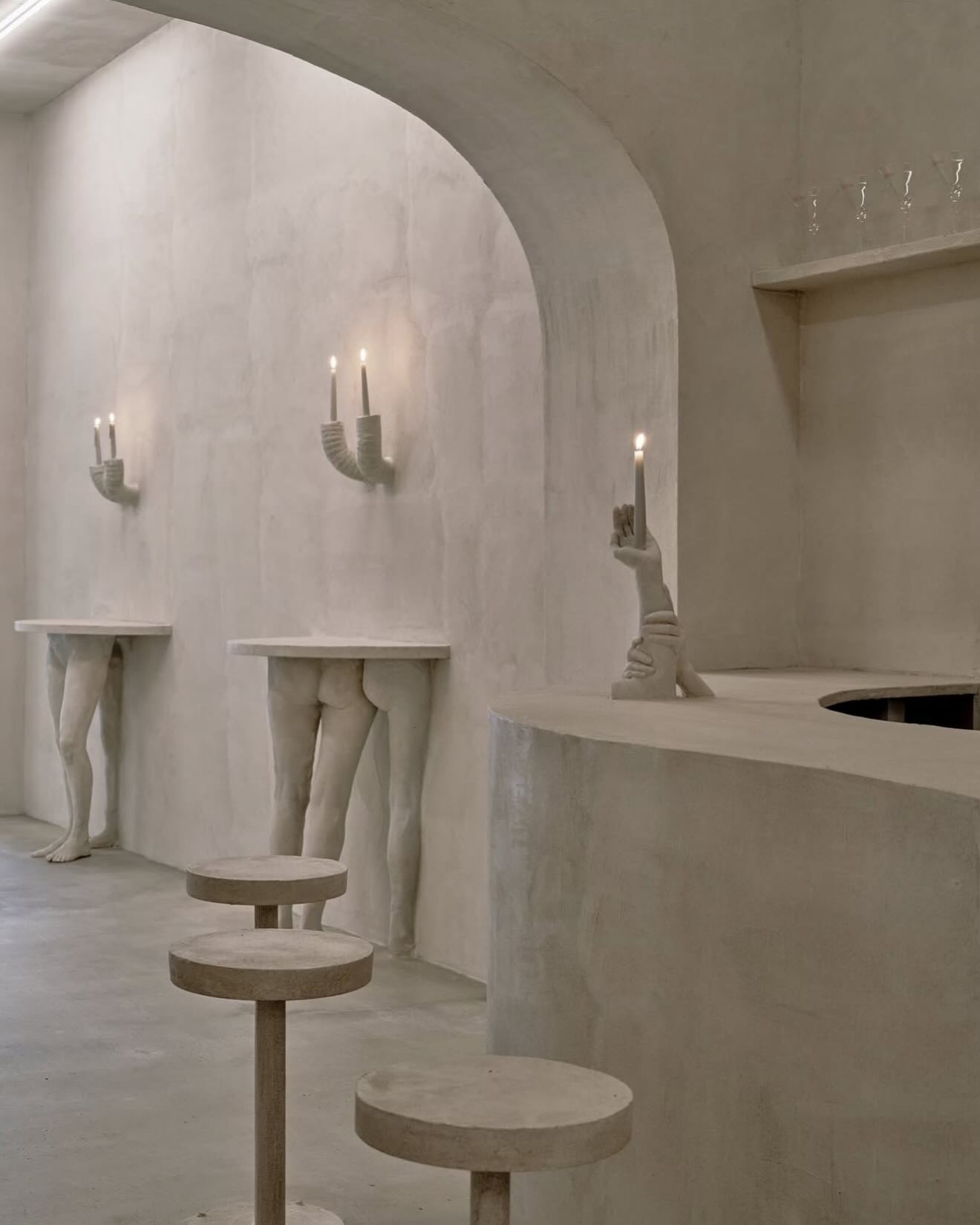 Destined to be a short lived experience, Far Bar is described as a “work of art you can grab a drink in” and it’s unlike anything you’ve ever seen. Designed as the ruins of the future, hands, legs and all types of body parts making up the structure of furniture and lighting coming up from hell or descending from heaven one only knows, all clad in plaster white except for the orange skies coming from a few of the arches.