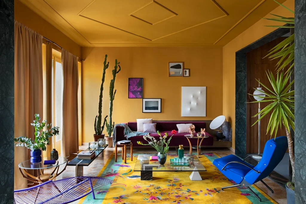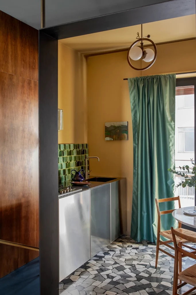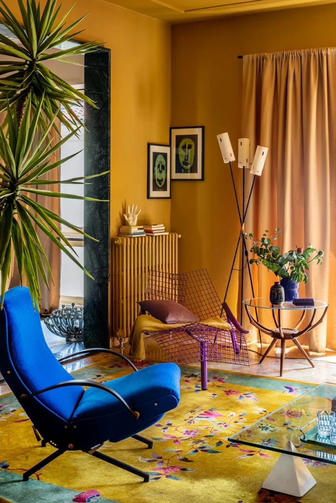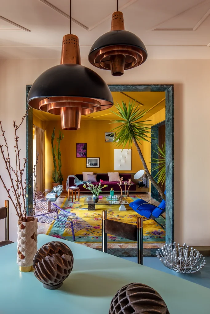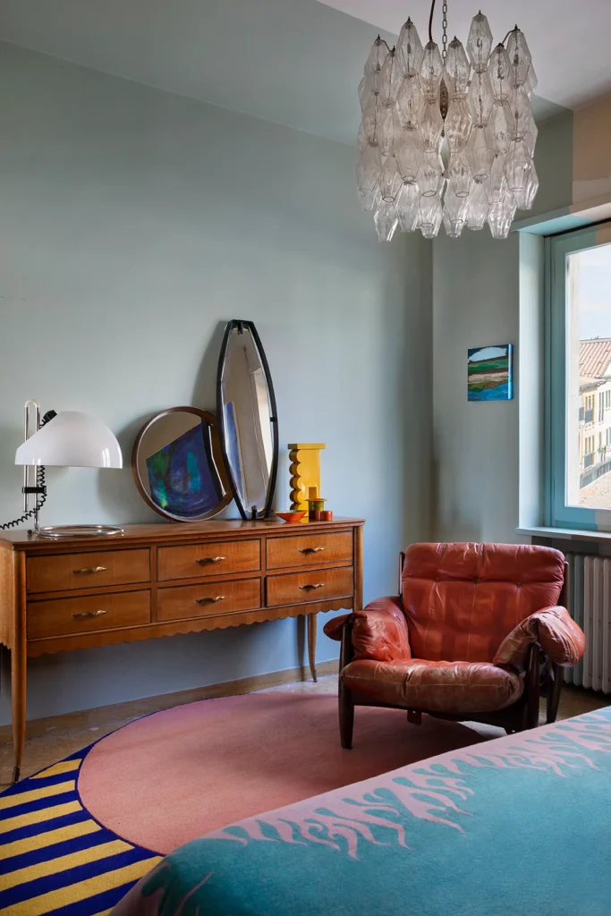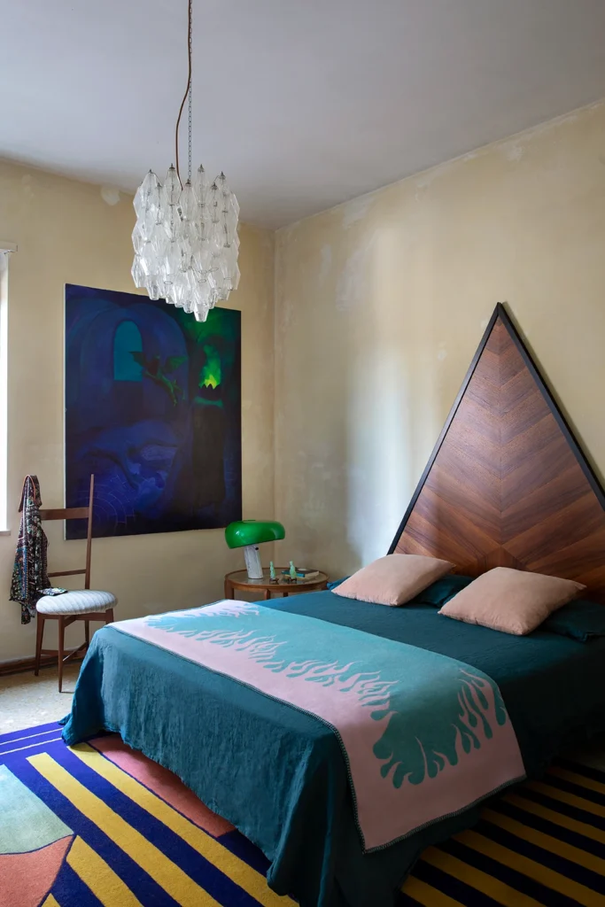 Giacomo is a fabulous designer with a great eye for color, and an abundant love of Italian design. Heavily inspired by the 50s for the renovations of the apartment, he then populated the space with furniture and accessories from every following decade, creating a one of a kind vibe, with unexpected pieces around every corner. My absolute showstopper favorite being the custom made triangular headboard, rawr !